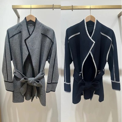 Autumn and winter light luxury pure handmade double-sided woolen shell embroidered edge half high collar medium length jacket