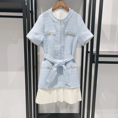 Fashionable sky blue tweed dress with waist tucked and pleated crew-neck skirt
