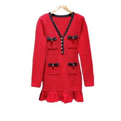 Early spring style Poinsettias with contrasting edges bow V-neck knitted diamond buckle short dress