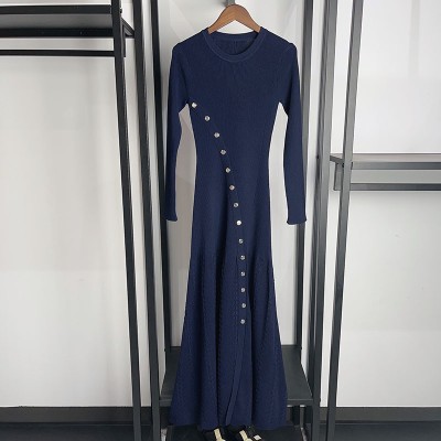 Elegant spring and summer metal diagonal buckle slim fit round neck threaded slit long dress