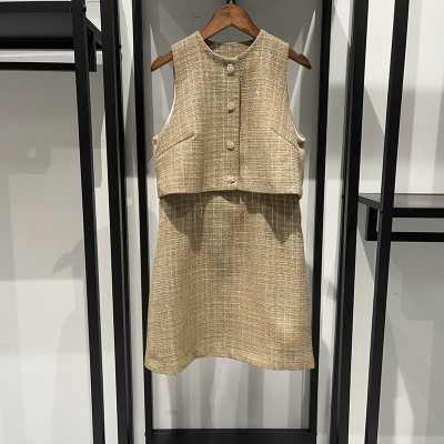 Early Autumn Vacation Two piece Dress Small Fragrant Wind Coarse Mesh Snowflake Diamond Button Set