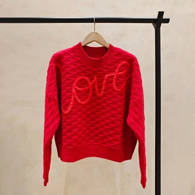 Christmas Red LOVE Jacquard Round Neck Texture Twisted Flower Hoodie Sweater