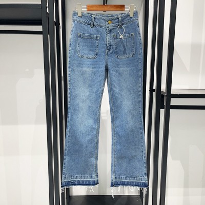 Early spring classic washed blue fringed snake button cotton denim slim fit cropped pants