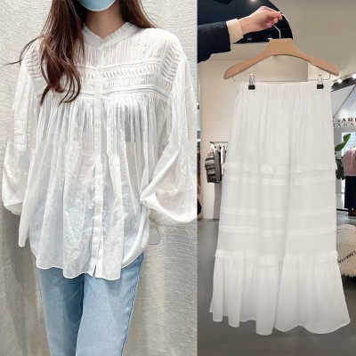 Early Spring Fashion Organ Fold Round Neck Lantern Sleeve Top Splicing High Waist Skirt Set