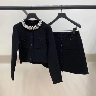 Early Spring Fragrance Black Bead Collar Commuter Knitted Top A-line Skirt Set